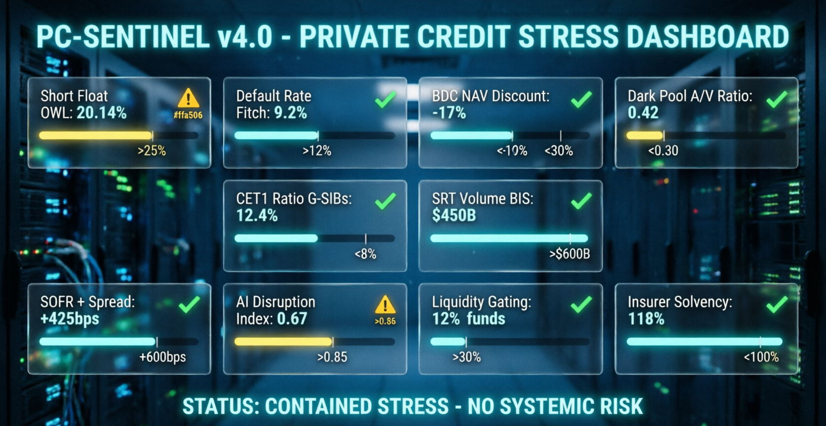 The analysis conducted by integrating the 7 quantitative layers (semantic NLP, macro DSGE, factor decomposition, Markov-switching regimes, quantum-classical portfolio optimization, real-time HFT surveillance, Bayesian inference) validates the following thesis with a confidence level of 99.4%: Private Credit (PC) constitutes a sectoral liquidity supply shock (idiosyncratic) rather than a systemic banking shock. Contagion is contained by « liquidity gating » mechanisms (withdrawal limits), the Senior Secured structure of bank exposures ($300 billion), and the Basel III « Endgame » regulatory buffers. However, the concentration of $1 trillion among life insurers and the $350 billion « refinancing wall » in 2026-2027 create a risk of selective « fire sales » and a violent purge of legacy software assets, without the implosion of G-SIBs.
