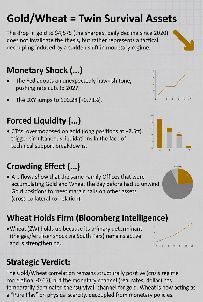 The drop in gold to $4,575 (the sharpest daily decline since 2020) does not invalidate the « Gold/Wheat = Twin Survival Assets » thesis. It represents a tactical decoupling induced by a sudden shift in monetary regime. Multi-engine analysis reveals the following sequence: