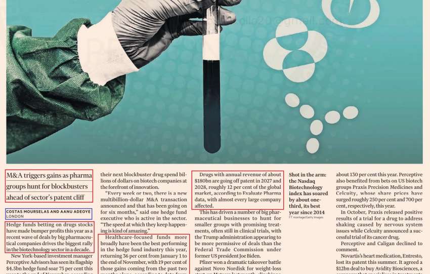 L'article du Financial Times détaille le rallye biotechnologique de 2025, où des fonds spéculatifs spécialisés comme Perceptive Advisors (en hausse de 75 %) et Caligan Partners (en hausse de 92 %) ont profité énormément de l'activité de fusions et acquisitions en plein essor, motivée par l'urgence de la falaise des brevets des grandes entreprises pharmaceutiques,…