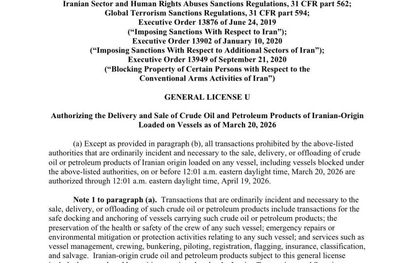 The U.S. Treasury's General License U (issued March 20, 2026) is explicitly designed to exert downward pressure on oil prices by flooding the market with additional supply at a time when prices have surged over 50% since the U.S.-Israeli conflict with Iran began in late February.
