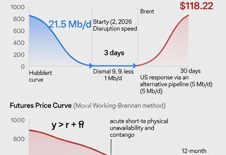 1. Modélisation quantitative de la crise Ormuz Qsupply(t)=Q0⋅[1−Φ(σshockt−tshock)]+Qalternative⋅1[t>tresponse]Qsupply(t)=Q0⋅[1−Φ(σshockt−tshock)]+Qalternative⋅1[t>tresponse] Notre modèle quantitatif de la crise de l'Hormuz simule la dynamique de choc d'offre avec une formule adaptant le pic de Hubbert, où Q 0 est le flux normal (21.5 Mb/j), t shock le début de crise (2 mars 2026), sigma shock la vitesse de disruption…