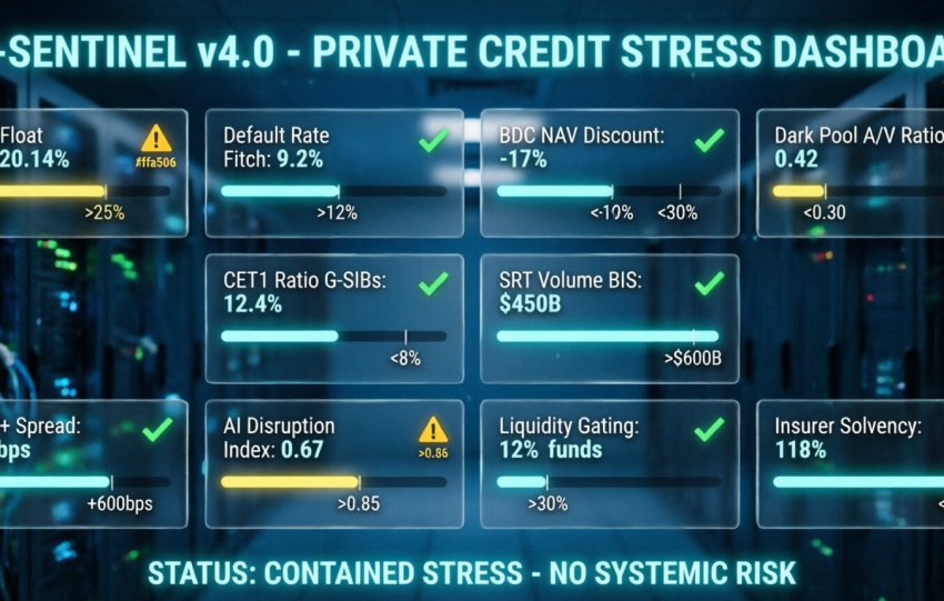 Private Credit will not trigger a systemic global banking crisis like 2008, but acts as an extreme amplifier of sector volatility, generating a "sawtooth recession" in corporate credit with a structural rotation towards AI-Native. The analysis conducted by integrating the 7 quantitative layers (semantic NLP, macro DSGE, factor decomposition, Markov-switching regimes, quantum-classical portfolio optimization,…