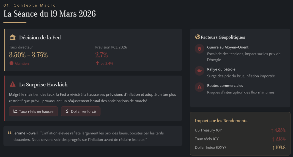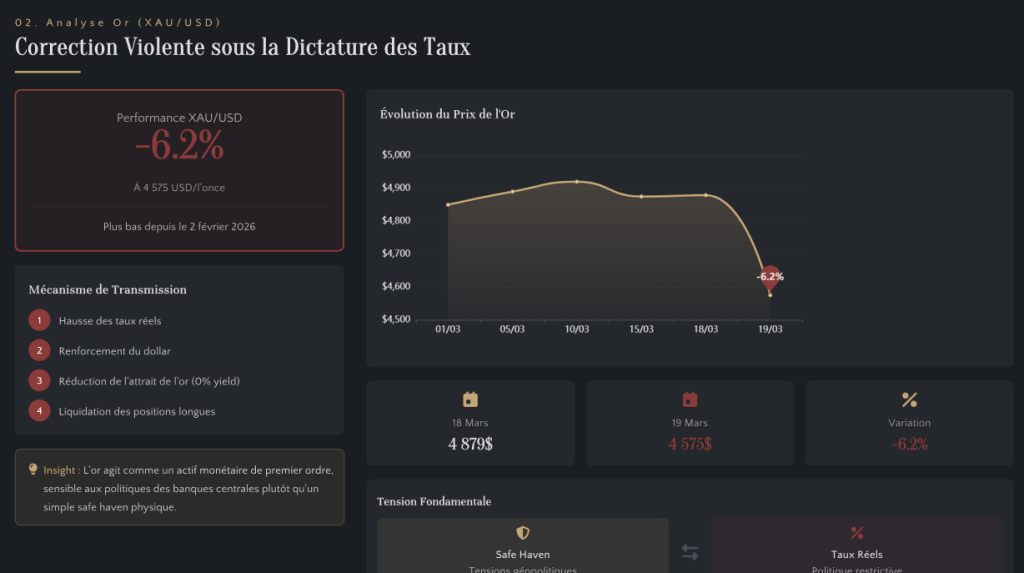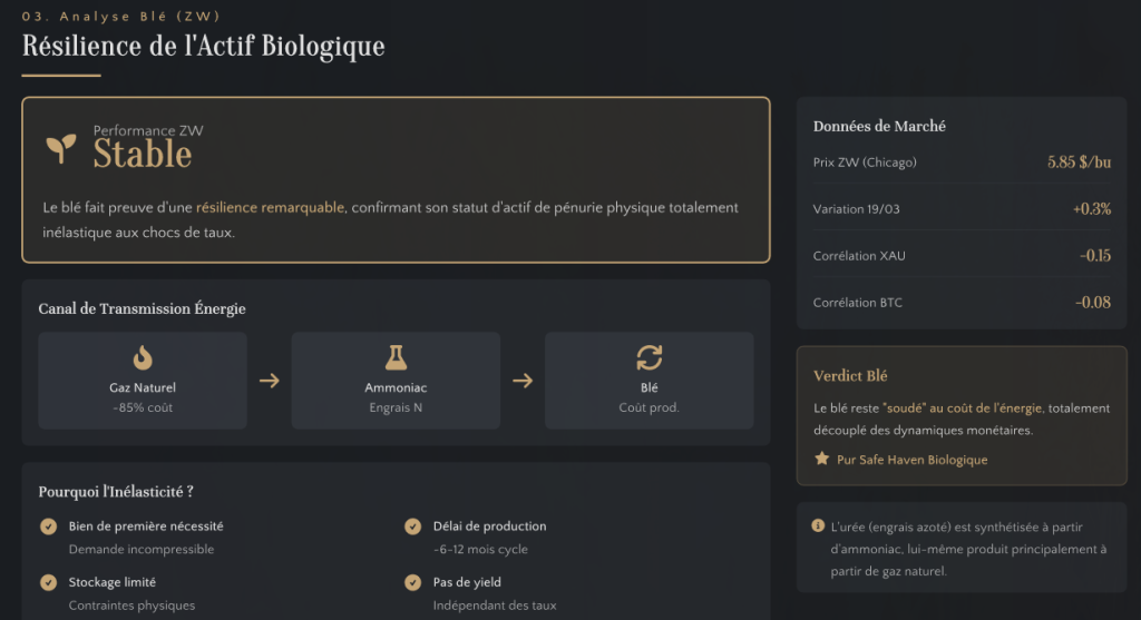 The session of March 19, 2026, brutally reestablished the hierarchy of risks during a systemic crisis. Wheat is the « sovereign » asset in the real economy. Its price is dictated by physical flows (gas, fertilizer, weather) that are totally inelastic to monetary policy. It is the only true biological « safe haven. » Gold is the « sovereign » asset in the financial economy, but it remains subject to the « dictatorship » of central banks and real rates. Its long-term store-of-value function remains intact, though it undergoes violent corrections under monetary tightening regimes.