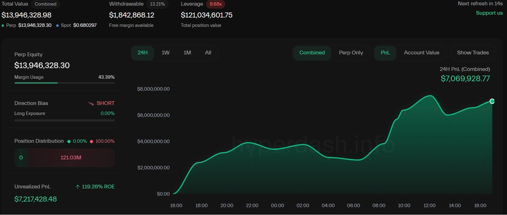 ❶ Wallet 0x5d (Short) : $121M exposés, +$7M en 24h (levier 8.68x).